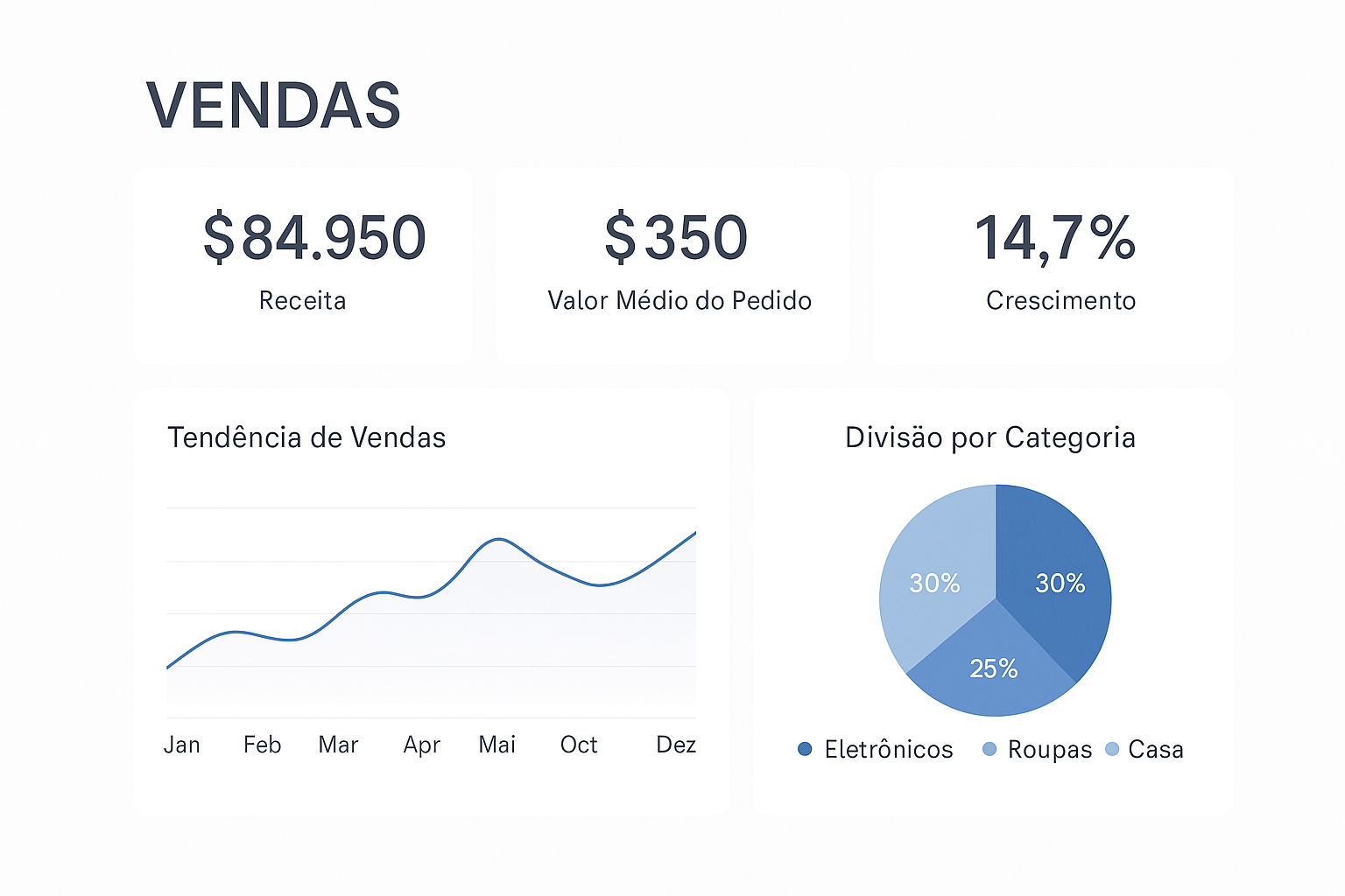 Visualização clara dos KPIs essenciais para monitorar a saúde do negócio diariamente.